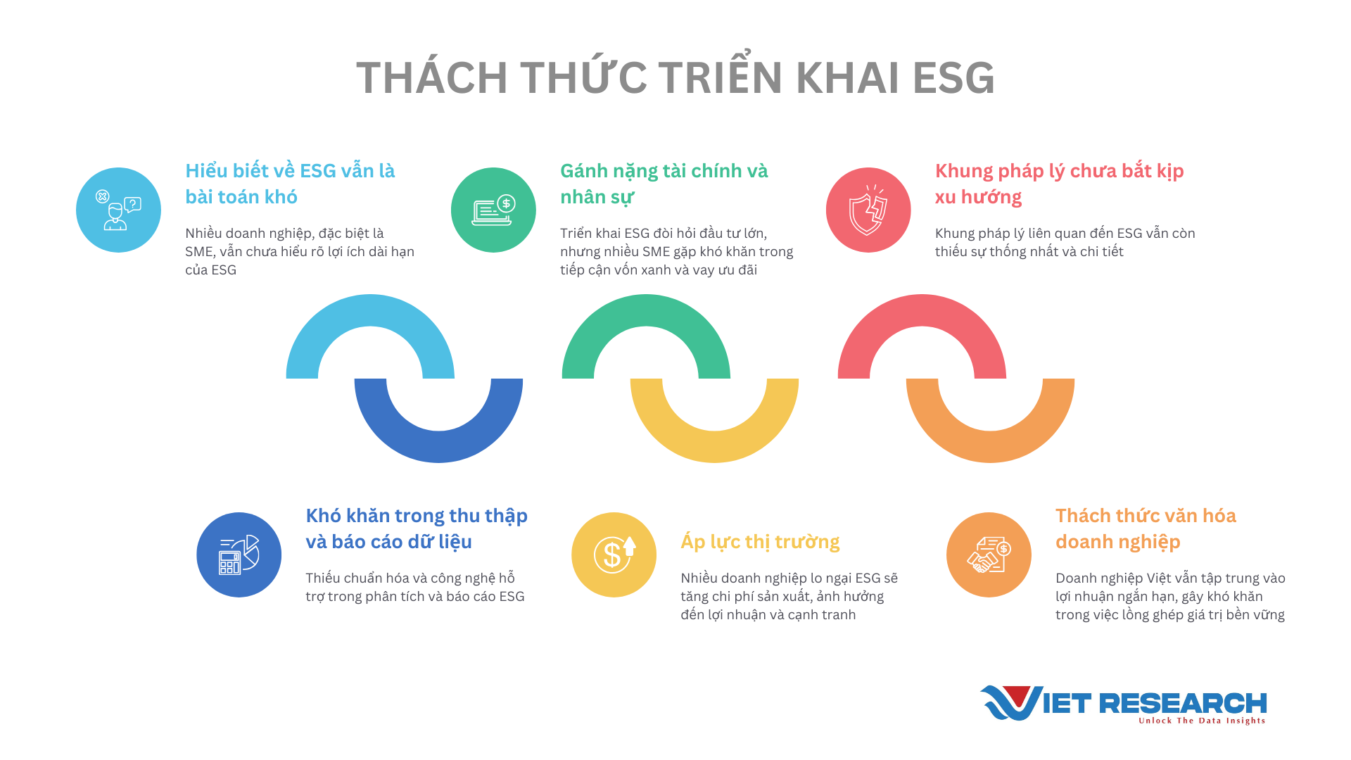 Doanh nghiệp Việt Nam đối mặt với nhiều thách thức khi triển khai ESG, từ nội tại doanh nghiệp đến các yếu tố bên ngoài như khung pháp lý và thị trường. Dưới đây là những khó khăn chính qua nghiên cứu và khảo sát Top 100 Doanh nghiệp ESG Việt Nam Xanh 2025 của Viet Research: